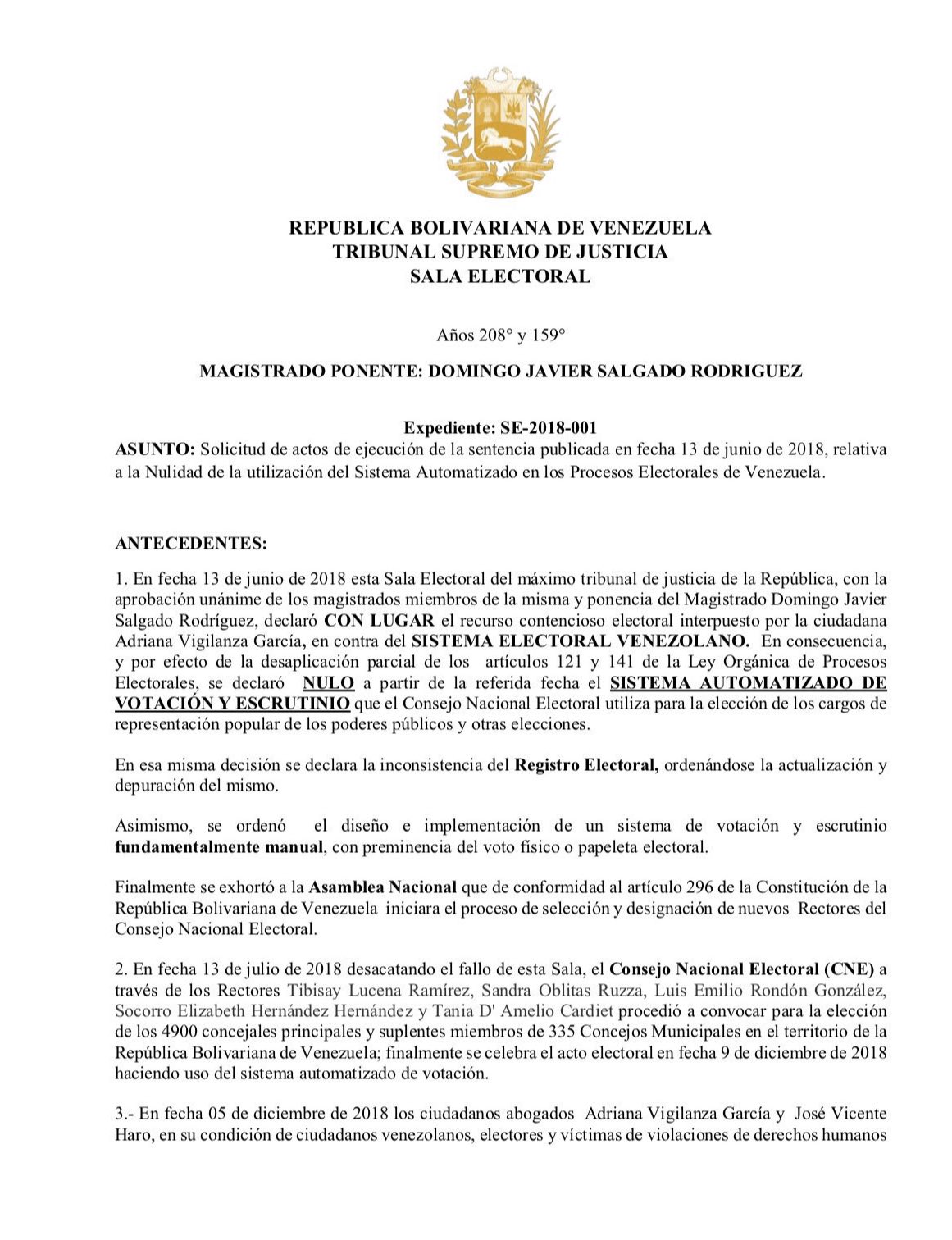 - A partir de Junio 13 de 2018 declararon NULO el SISTEMA AUTOMATIZADO DE VOTACIÓN Y ESCRUTINIO que el Consejo Nacional Electoral utiliza para la elección de los cargos de representación popular de los poderes públicos y otras elecciones.